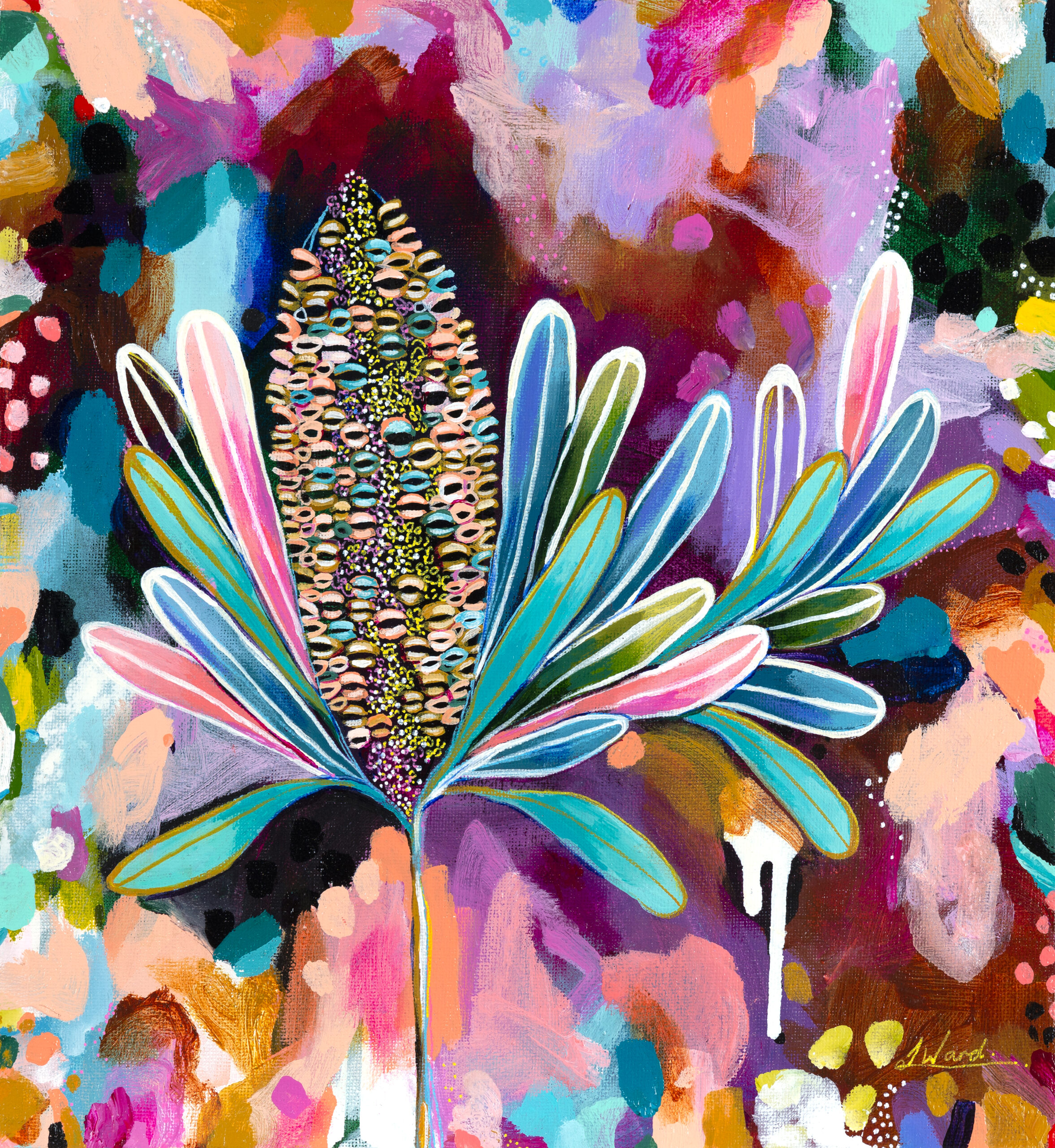 A vibrant artwork bursting with colour. This painting is part of the Rainbow Banksia collection and is inspired by the beautiful coastal Banksias, that line shores of many rivers and beaches in Australia. My creative practice is heavily influnced by the Banksia, as I feel a deep connection to this plant.