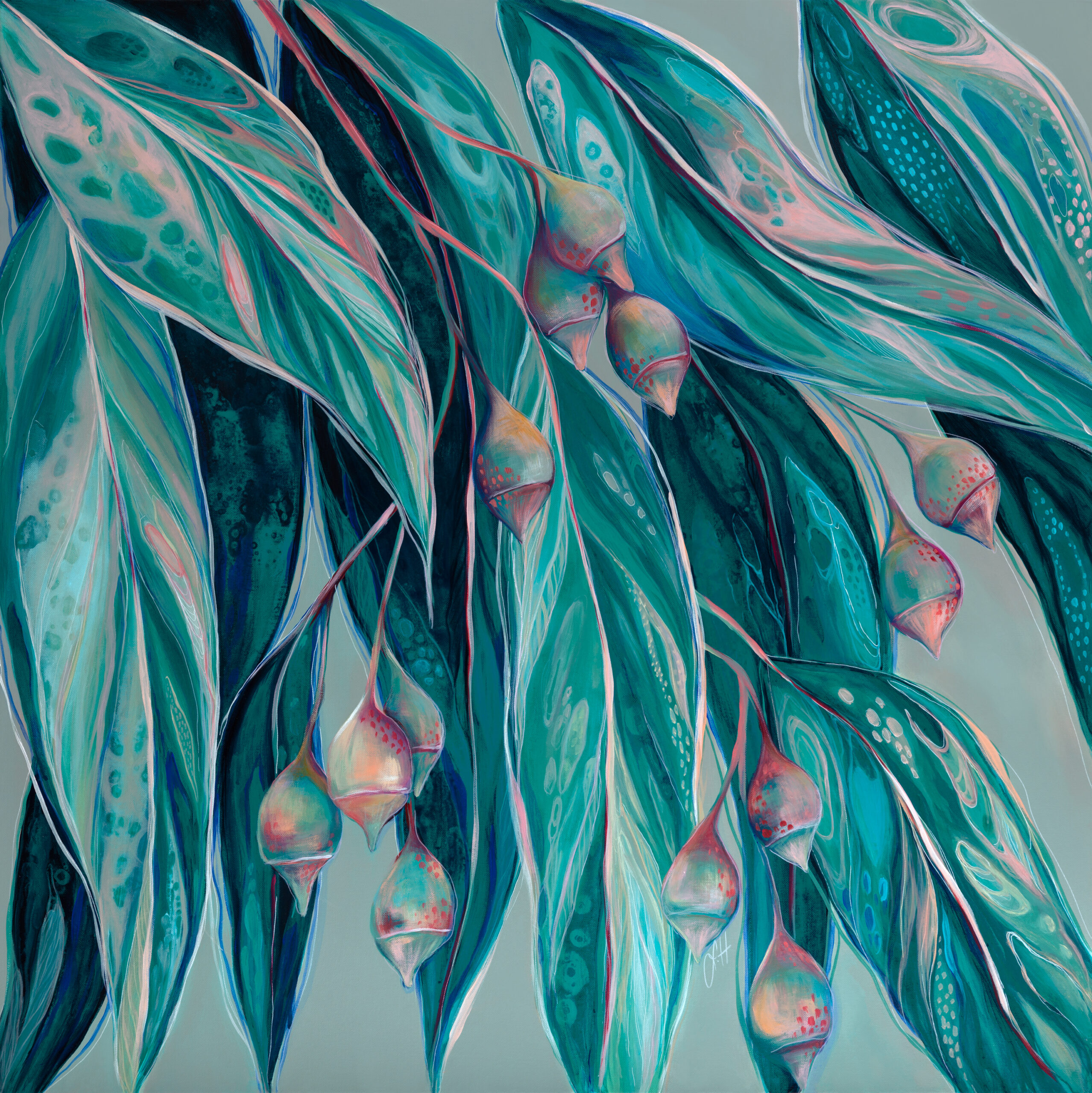 My inspiration for this piece came when I was driving along a very fire affected road here on the South Coast. Only 2 months before it had been ravaged by bushfires, and on that day- I marveled at how green it had become already. Beautiful lush growth was sprouting from the blackened bellies of Gumtrees for miles. My heart was so full at how our Australian natives manage to flourish after fire, I wanted to capture the essence of that resilience.