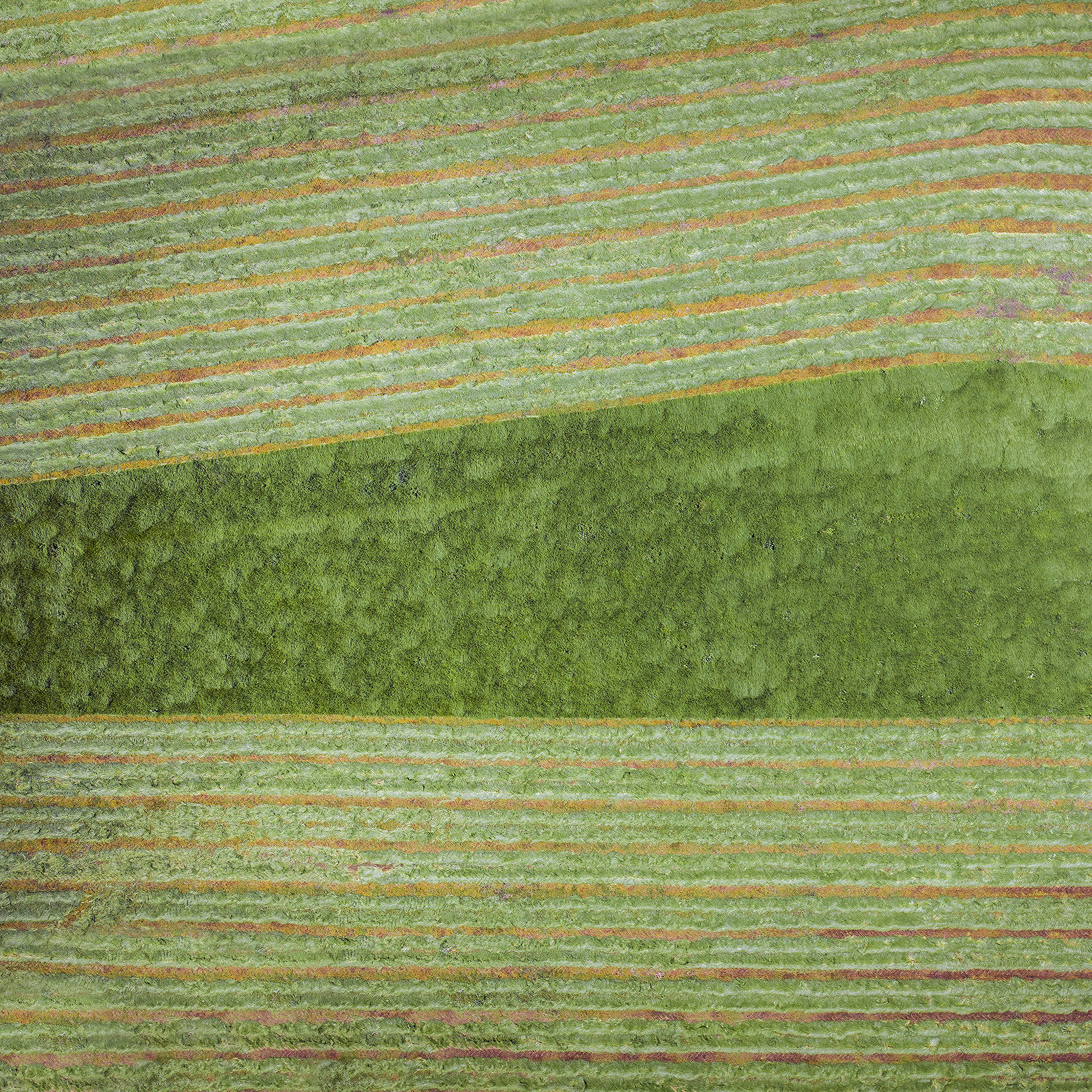 From high above, I was drawn to the unique art that the farmer was inadvertently creating as he mowed his field, revealing a unique and fleeting pattern.