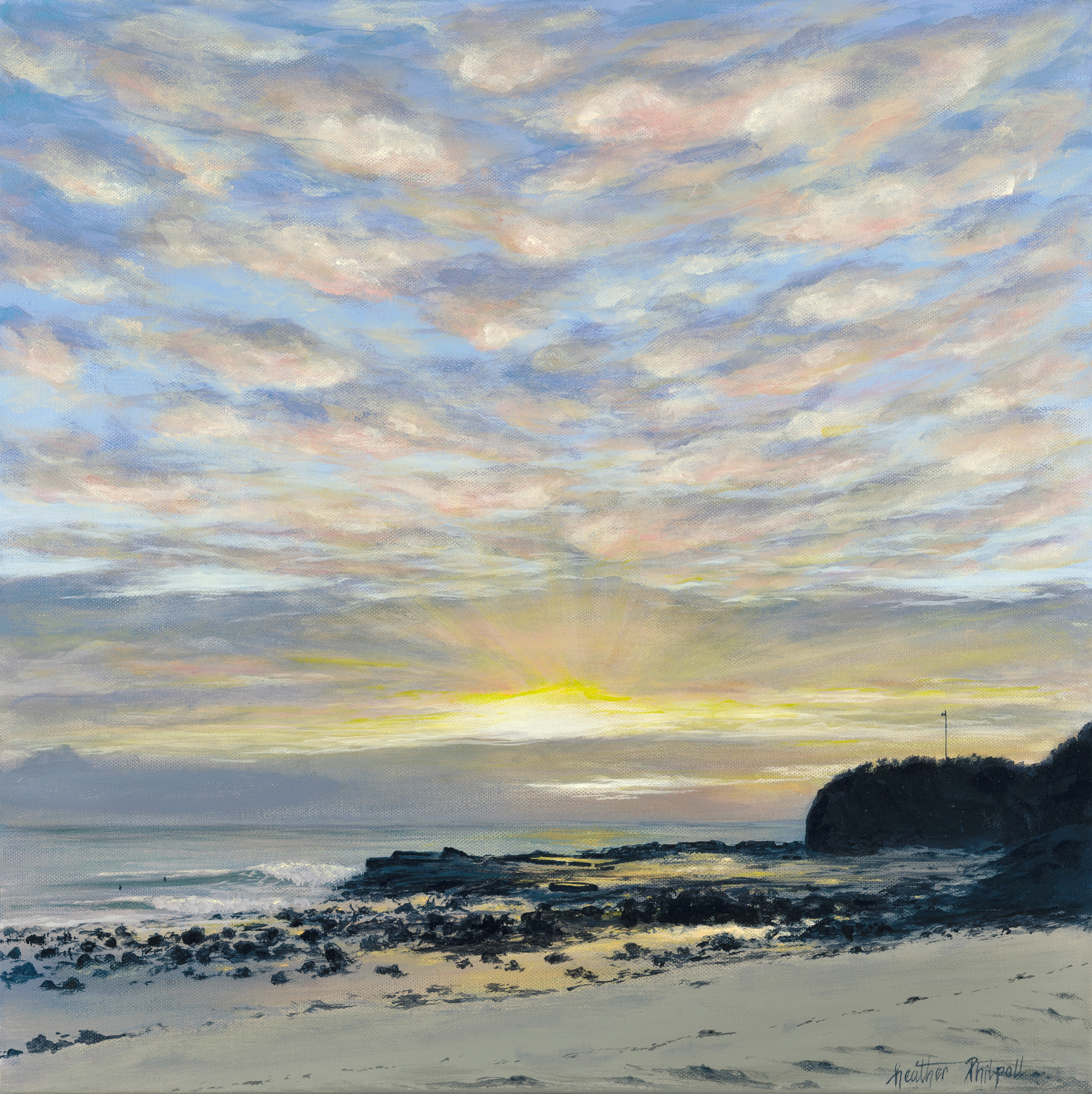 I love how the emerging sun in this arrwork has turned the two ocean rock pools into pools of liquid gold. I have painted in two tiny surfers out for an early surf and enjoying the spectacle of sunrise.