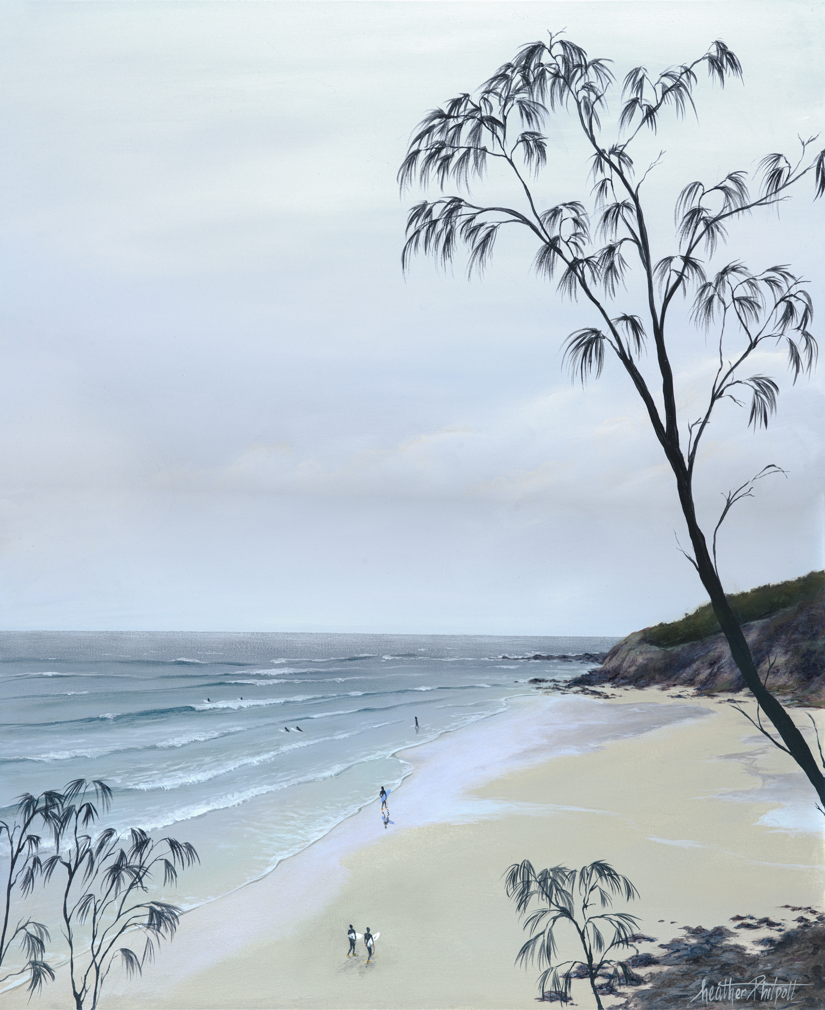 Wategos Beach Byron Bay. This artwork is reminiscent of holiday joys in the past and dreaming of those we can look forward to. I painted this artwork during a Covid 19 lockdown when I was supposed to be on holidays in Byron Bay.