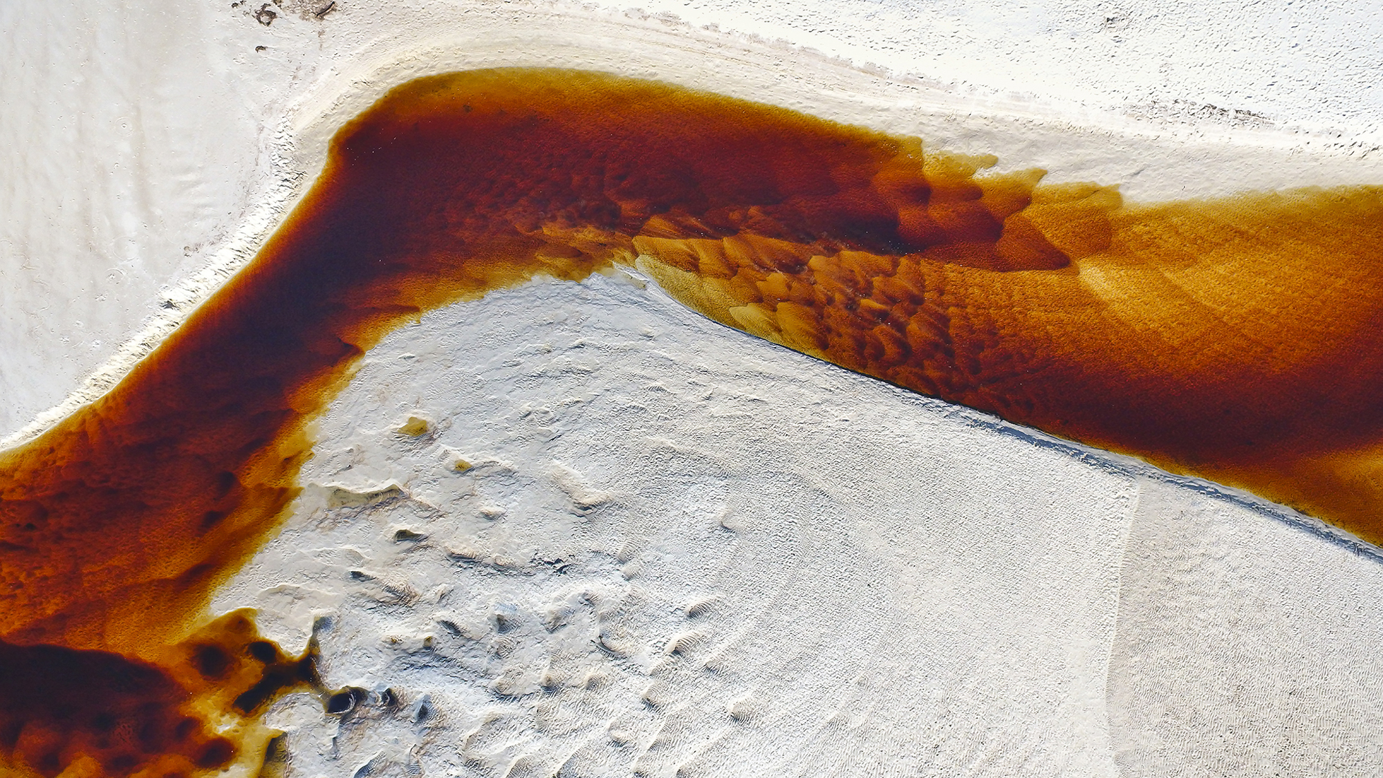 The mixing colours of stirred-up Tea Tree tannins and seashore shallows create a unique and original perspective, which can only be seen from above.