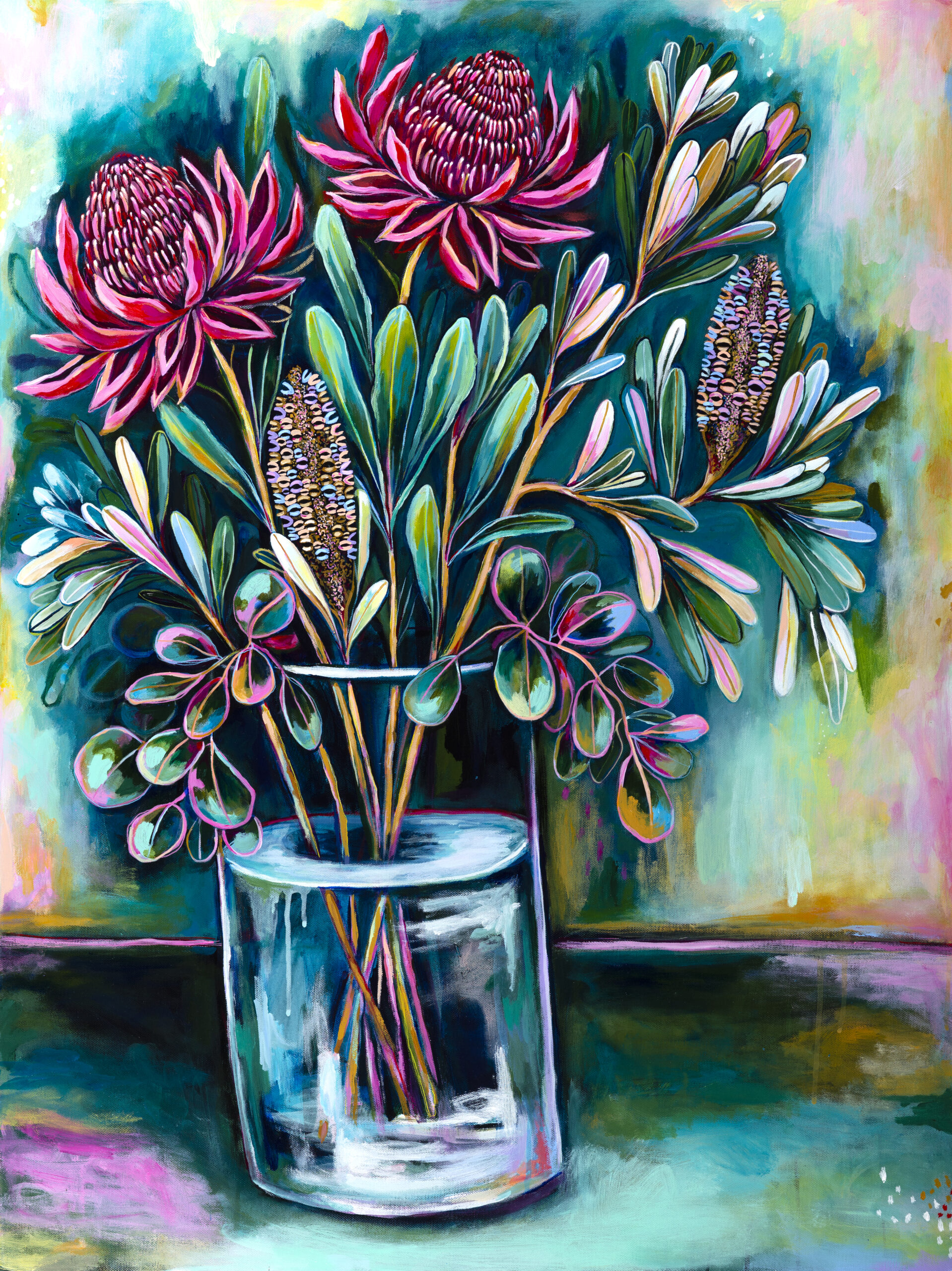 My World is Infinitely Happier with You,is a vibrant expressive artwork that aims to capture the beauty of a freshly cut bunch of Native Austalian flowers. This beautiful artwork was created with a strong sense of gratitude and appreciation, for both my family and my creative outlet. Just like a beautiful bunch of flowers, creating art at home surrounded by family, makes my world infinitely happier.