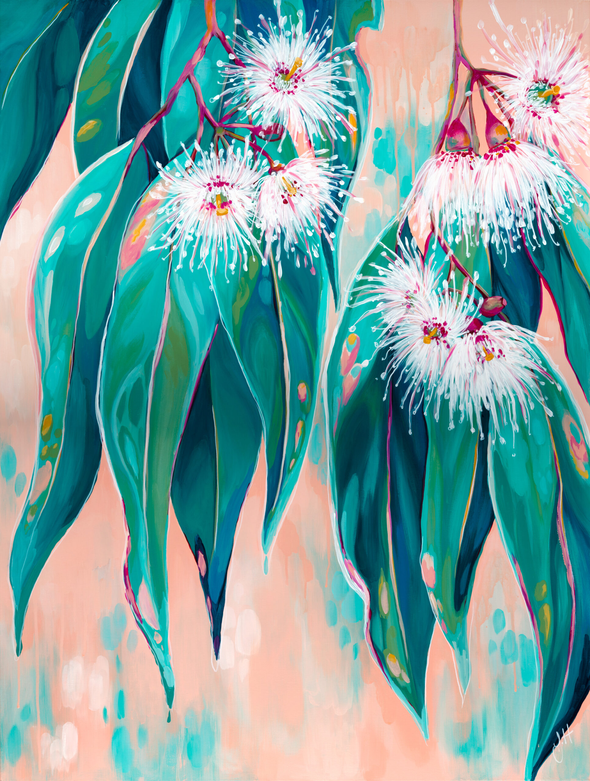 ‘Peachy’ was inspired by the beautiful gum trees of the South Coast. The background is the softest peach with drippy layers that remind me of winter rain. Painted in all of the gorgeous greens of our beautiful bush with vibrant white gum blossoms with hints of magenta and mustard.