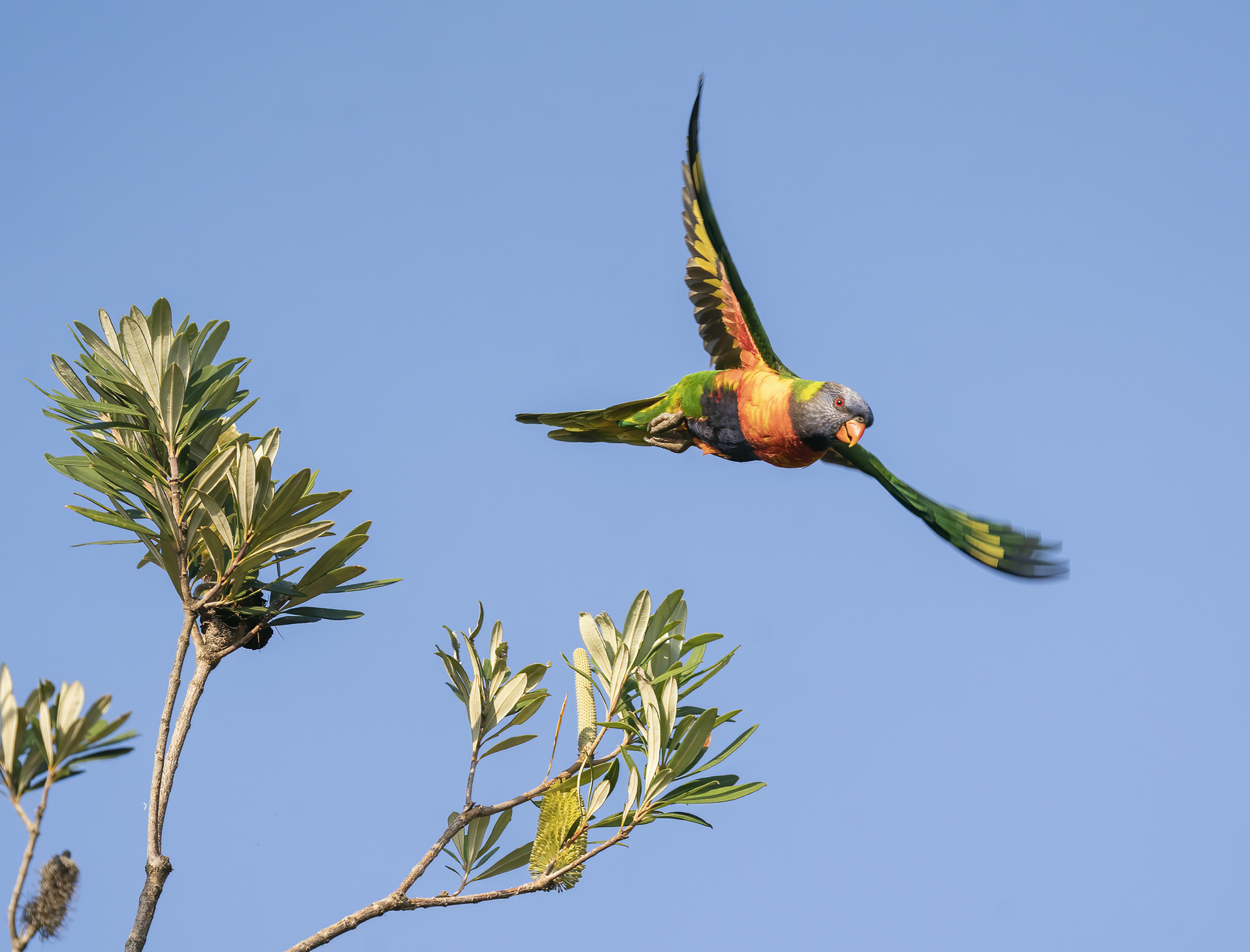 I love photographing birds in flight, and this colourful Aussie native caught my eye as it moved from tree to tree whilst feeding..
