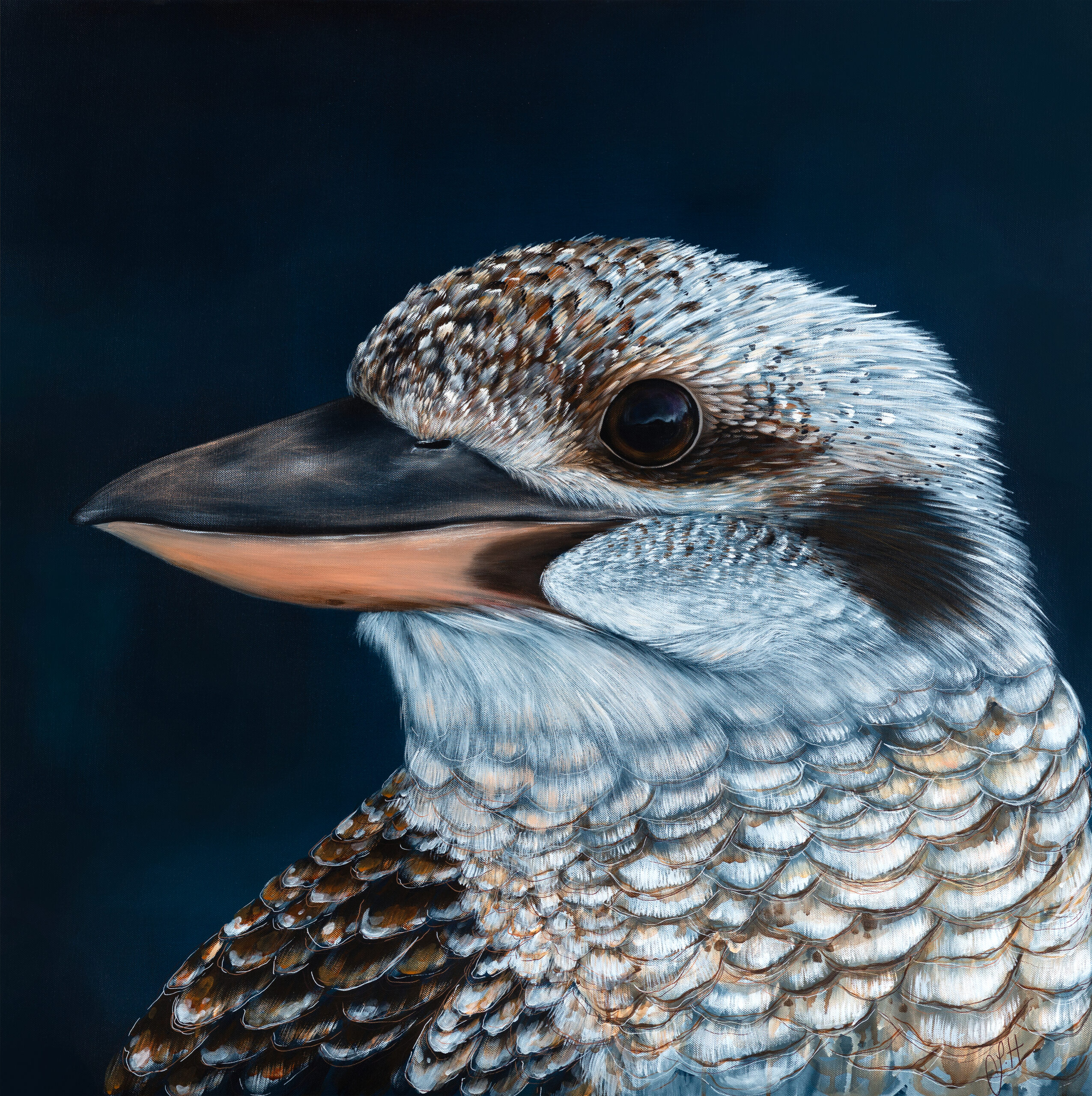 ‘Reflection’ is a beautiful Laughing Kookaburra captured by talented photographer Kristeen Baggetto – she captured a magical scene in his eye and I was very honoured to have the permission to paint him. He has a sense of strength about him that I just love, and the deep colours of his feathers against the inky blues of the background make this a statement piece for any room.