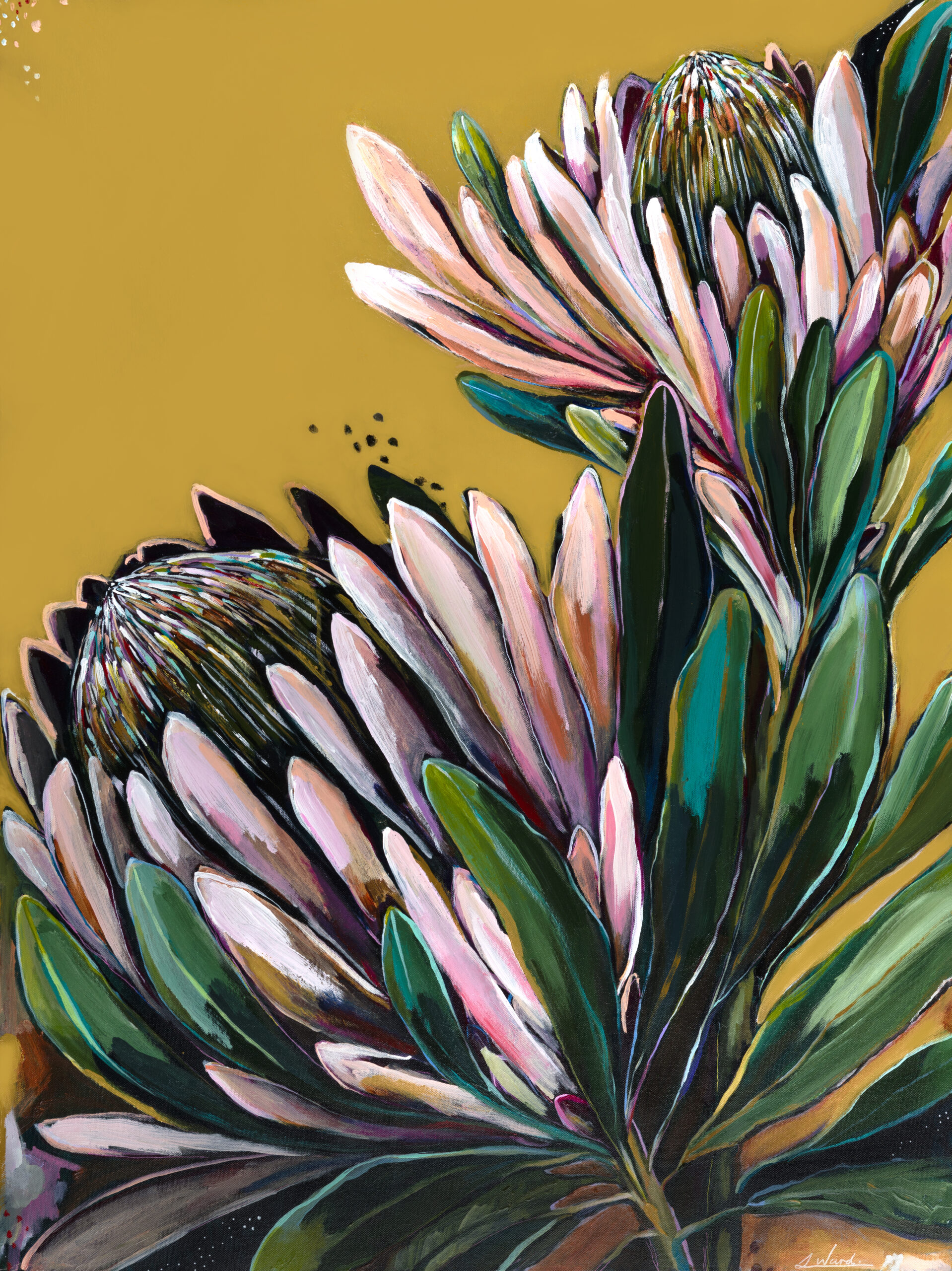 Painted from onsite photos of the most beautiful garden of flowering Proteas, this artwork is filled with happiness.