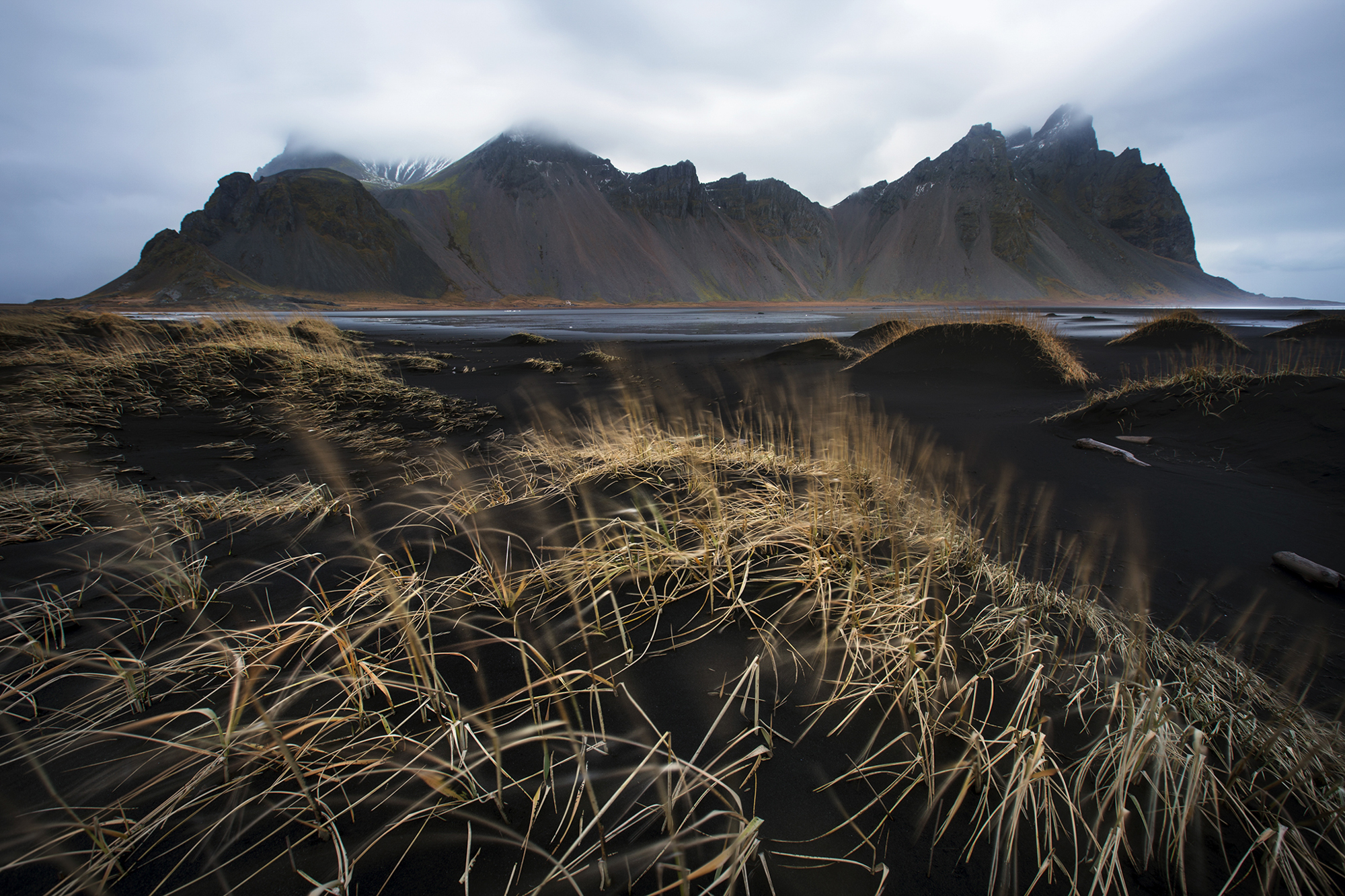 Another typically epic Icelandic scene, with windswept dunes with distant mountains.