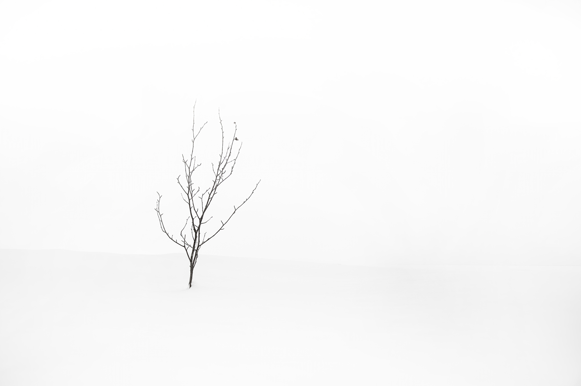 Out on the wintery snow-covered lake shore is a single solitary tree, with just two leaves left.